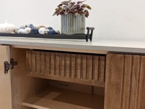Stunning floating media cabinet with handcrafted vertical slat door design in light wood tones and rich walnut top