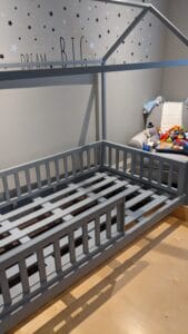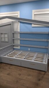 Craftsmanship detail showcasing custom blue cabinet with wood countertop and floating shelves for holiday decor display
