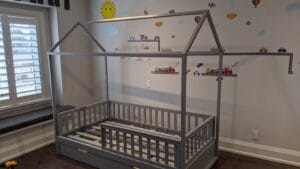 Bold contemporary bedroom design with floor-to-ceiling black slat wall treatment and matching custom furniture