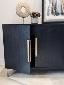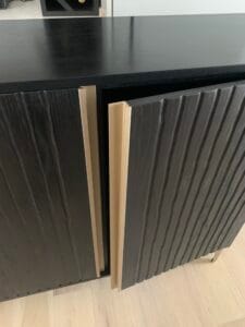 Contemporary dresser detail showcasing bold black and natural wood contrast with clean modern hardware